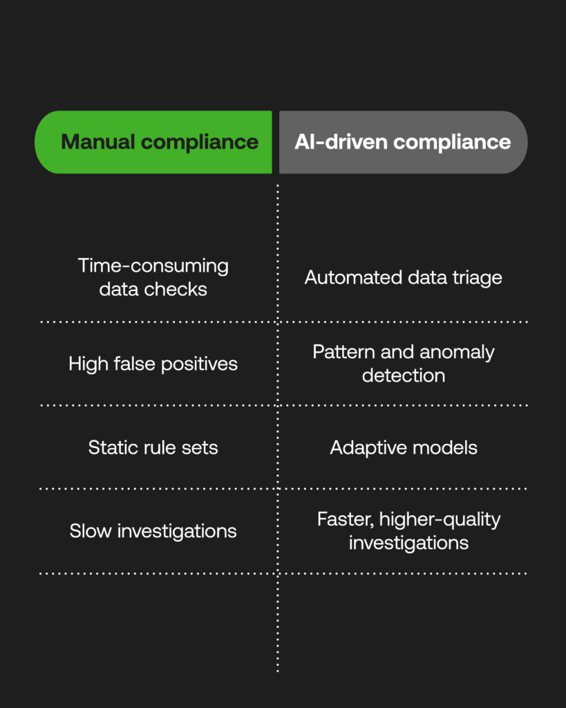 AI’s impact on Anti-Money Laundering (AML) processes already bears fruit. In taking away manual, inflexible tasks that hindered compliance team methods, they’re given back valuable time for identifying genuine fraudulent activity. This automation is paramount, as organisations face more data than ever, newly released digital assets, financial products, and changing customer bases.
