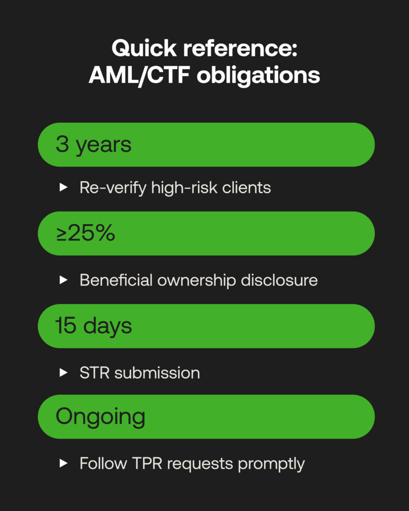 Reporting any cash transactions, assets, or property made or held by those with sanctions or terrorist affiliations must be immediate. Institutions are accountable for scrutinising clients thoroughly and routinely. The Amendment Bill has aimed, at least, to be more transparent about timelines or obligations involving varying circumstances.